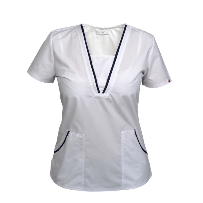 Eleganta modelelor R-line este subliniata de aceasta noua bluza medicala de dama, pastrand linia chic ii aduce un aer usor diferit. Combinatiile de culori ofera noi posibilitati de a le asorta cu pantalonii acestei linii.
